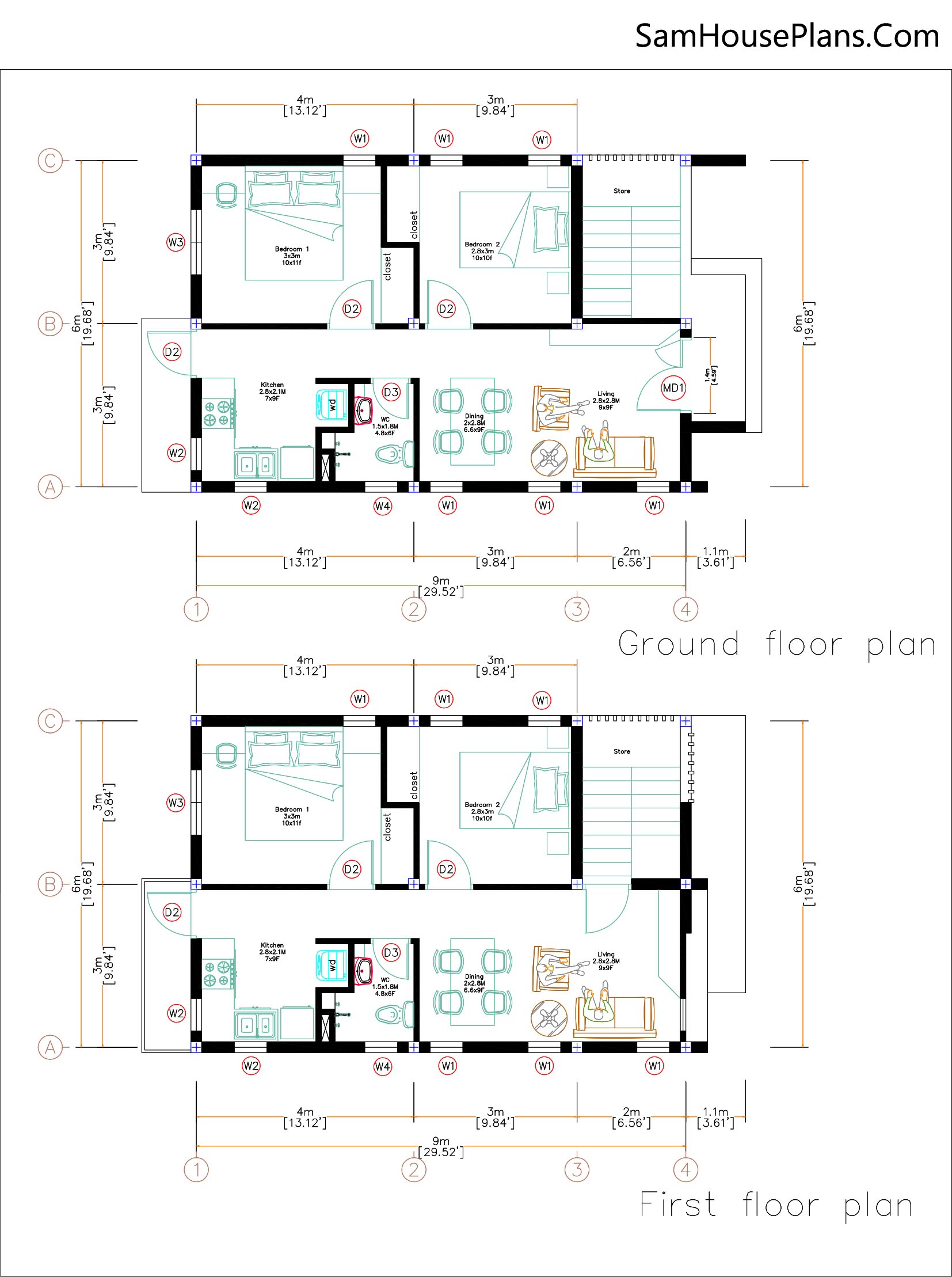 20×30 Small House Plan 6×9 M with 2 Bedrooms Each Floor Full PDF Plans. This house is perfect for Two family that need 2 bedrooms.