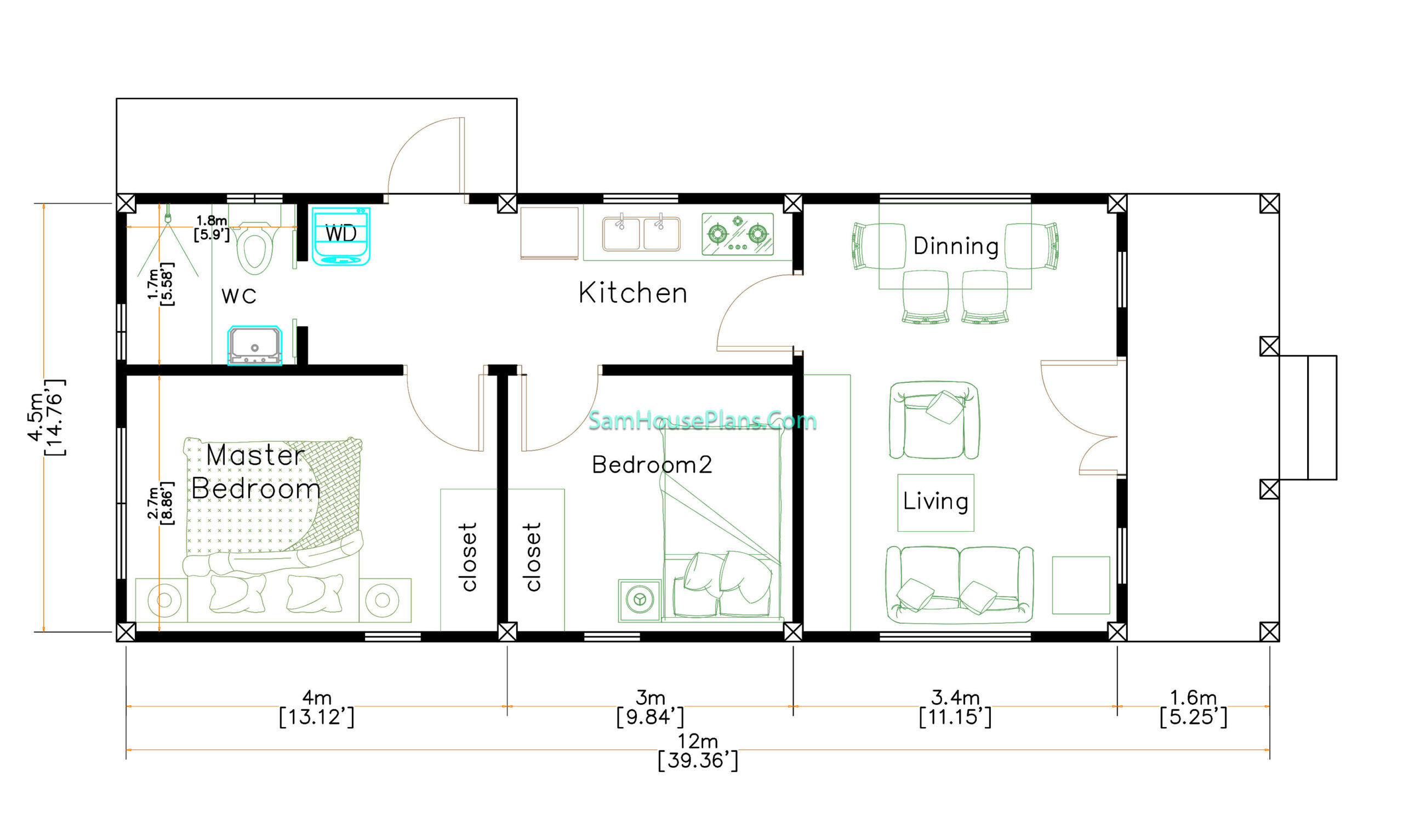 4.5×12 Small House Design 2 Bedrooms Shed Roof 15×40 Feet Full Plans. This villa is perfect for small family that have two bedrooms. Est. Price around 13k-18k usd.