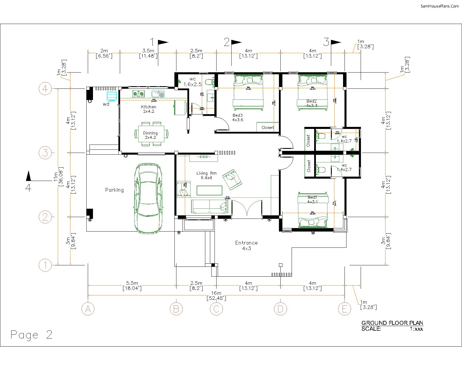 Home Plan 11x16m Meter 52×39 Feet 3 Bedrooms Has: