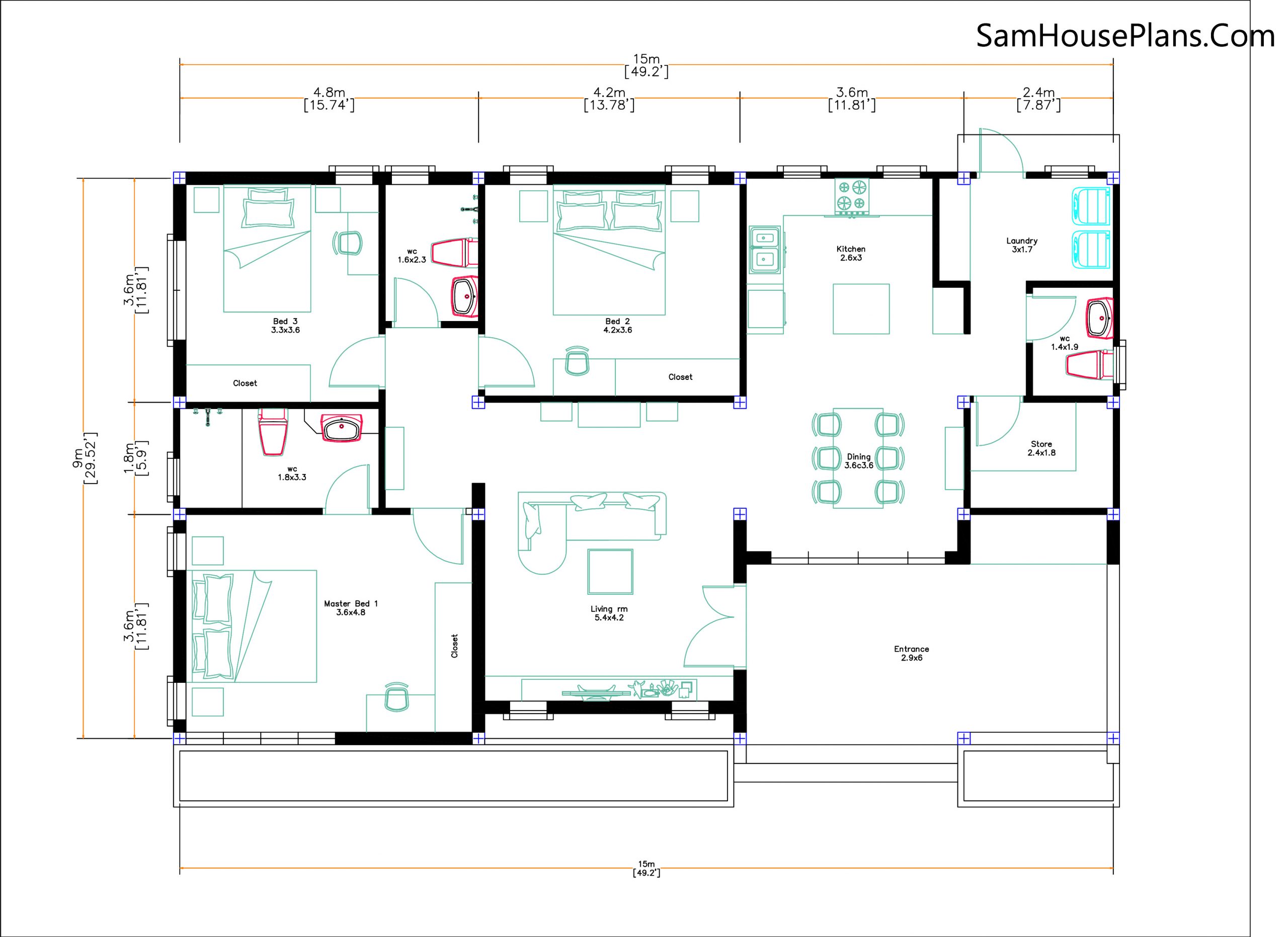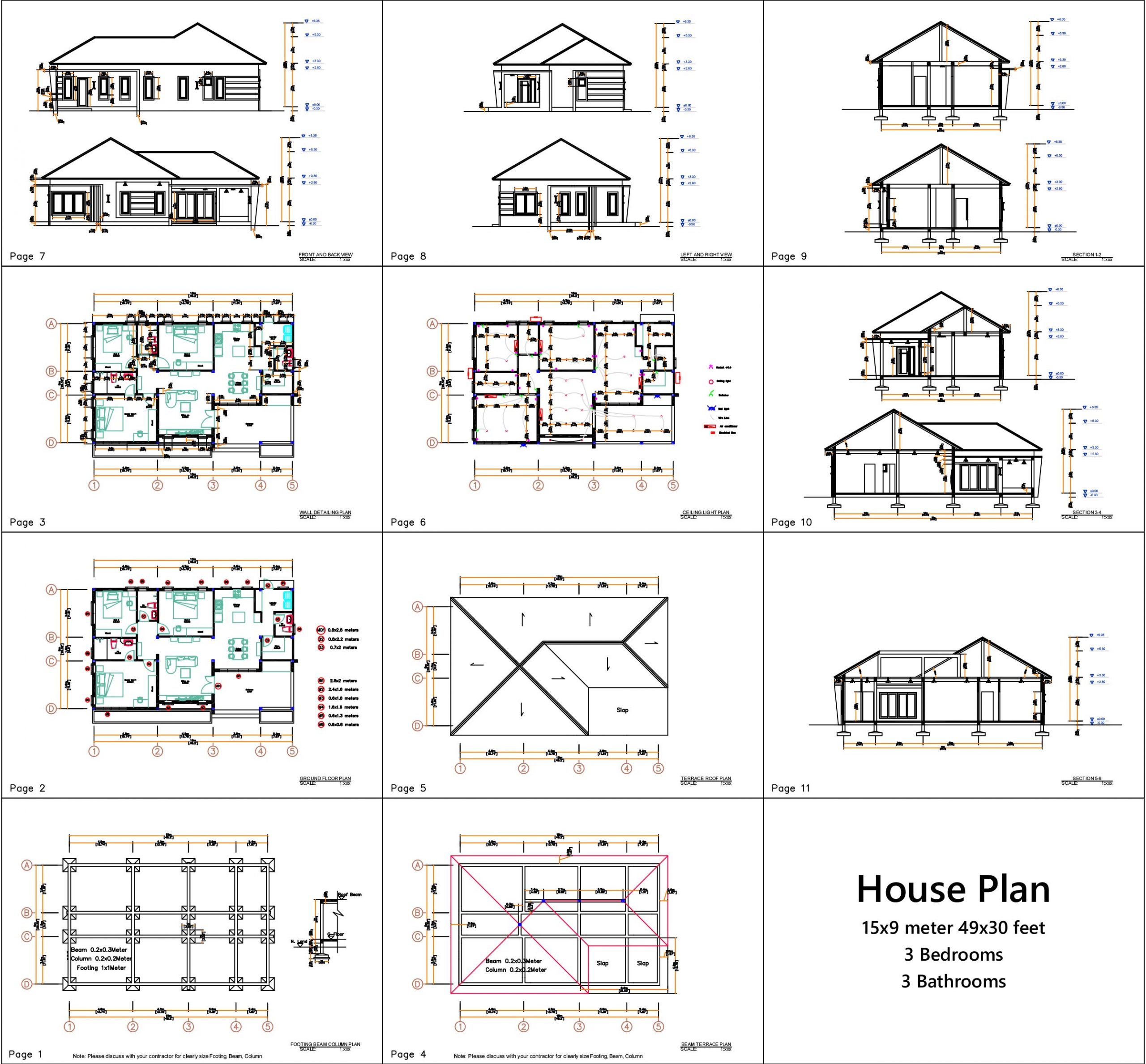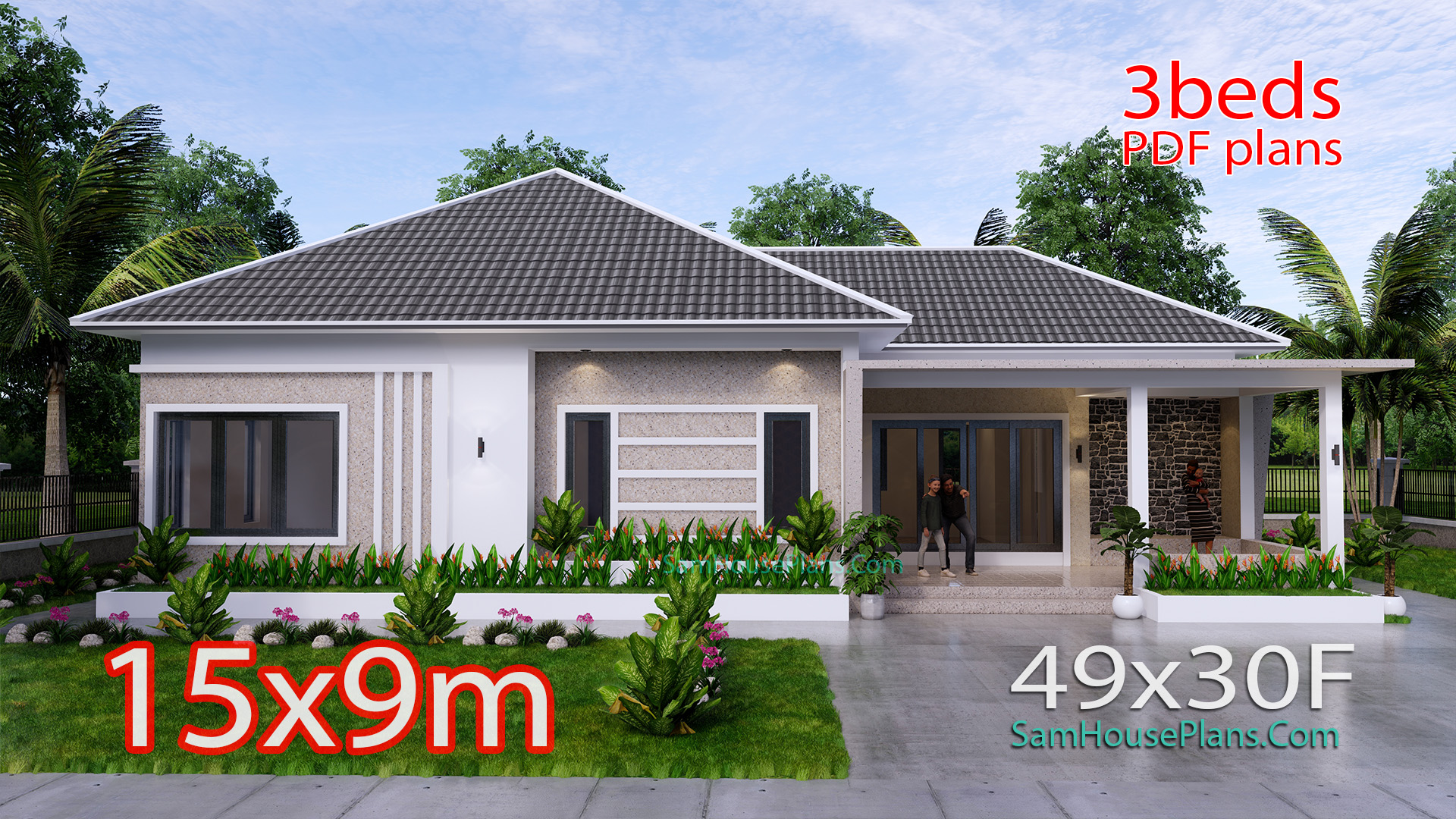 House Design Plan 15×9 M with 3 Bedrooms 49×30 Feet hip Roof PDF full plan. This villa is modeling by SAM-ARCHITECT With One story level. It’s has 3 bedrooms 3 Bathrooms.