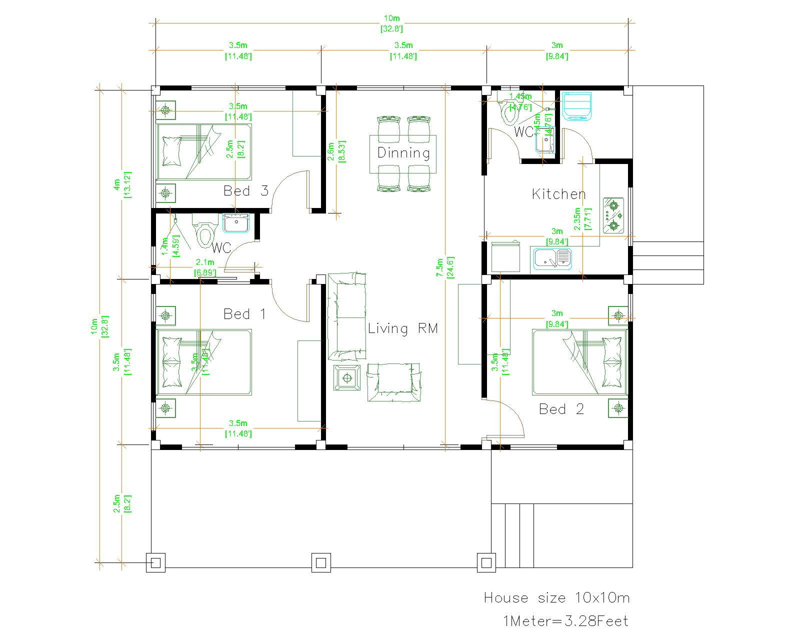 House Plans 10×10 Meter 33×33 feet with 3 Bedrooms full interior. This villa is modeling by SAM-ARCHITECT With One story level. It’s has 3 bedrooms 2 Bathroom.