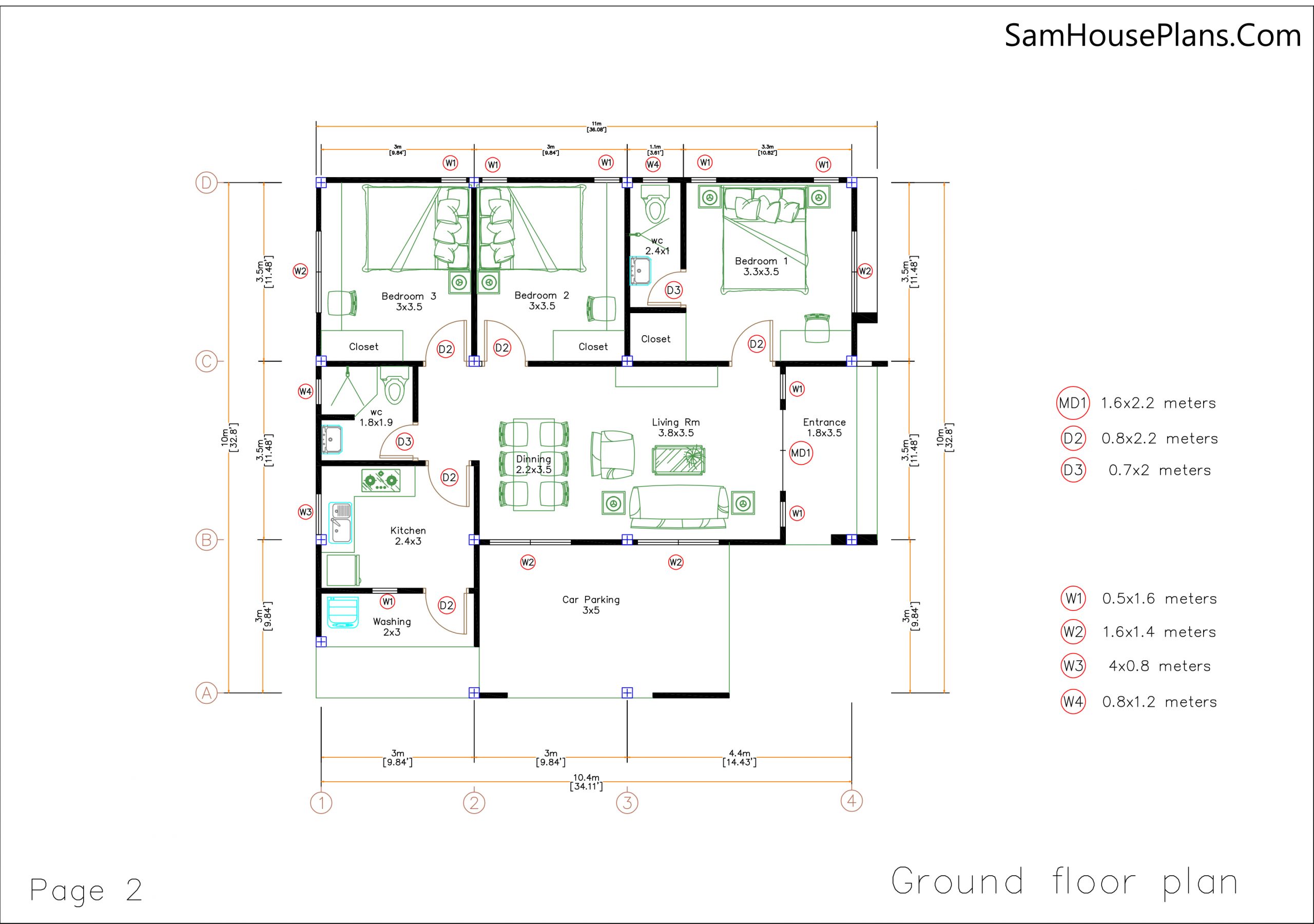 Building size: 33 feet wide, 36 feet deep. In Meters 10×11