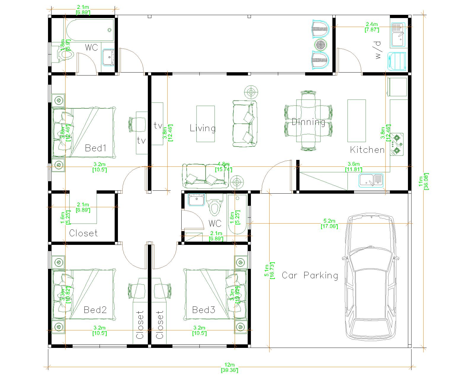 Luxury House Plans 12×8 Meters 40×26 Feet 3 Beds