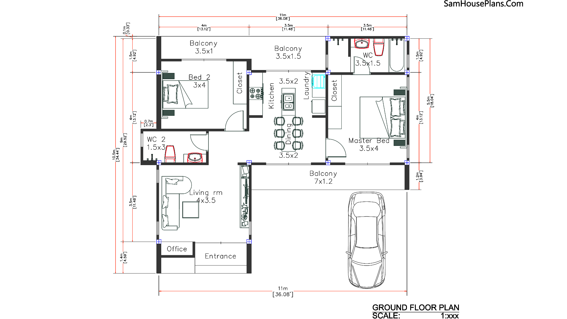 Building size: 36 feet wide, 35 feet deep 11×10.5 Meters