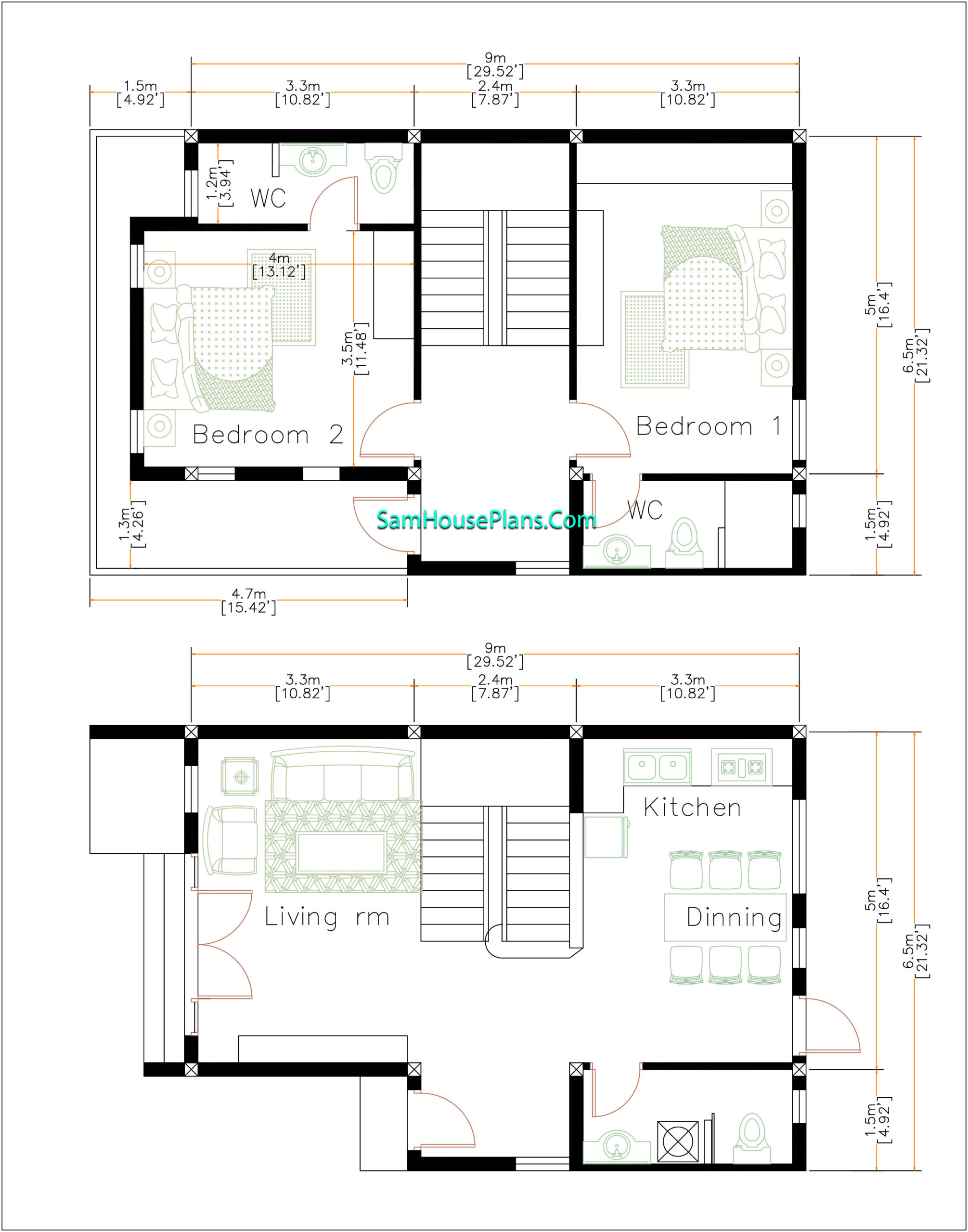 Sketchup Home Design Plan 6.5x9m with 2 Bedrooms 1