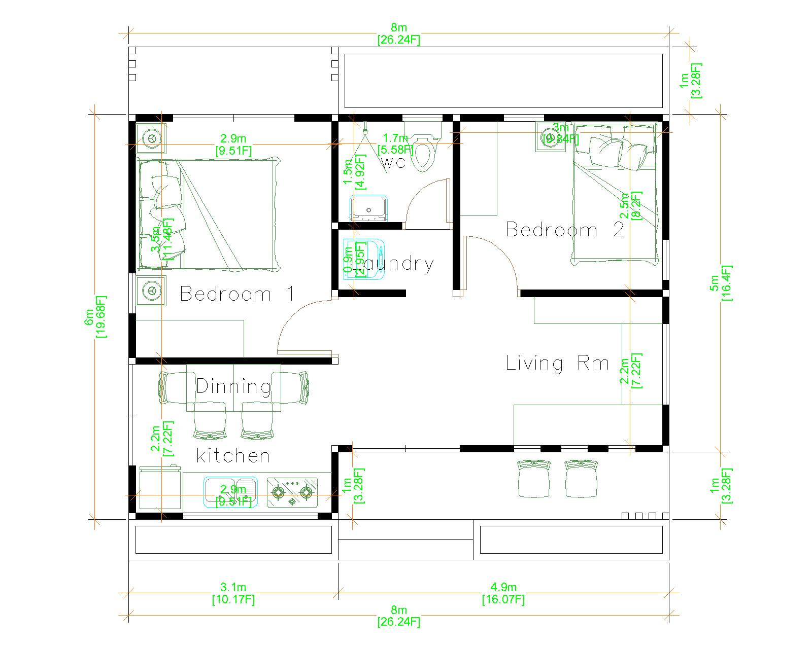 Small House Design Plans 8×6 with 2 Bedrooms Gable roof