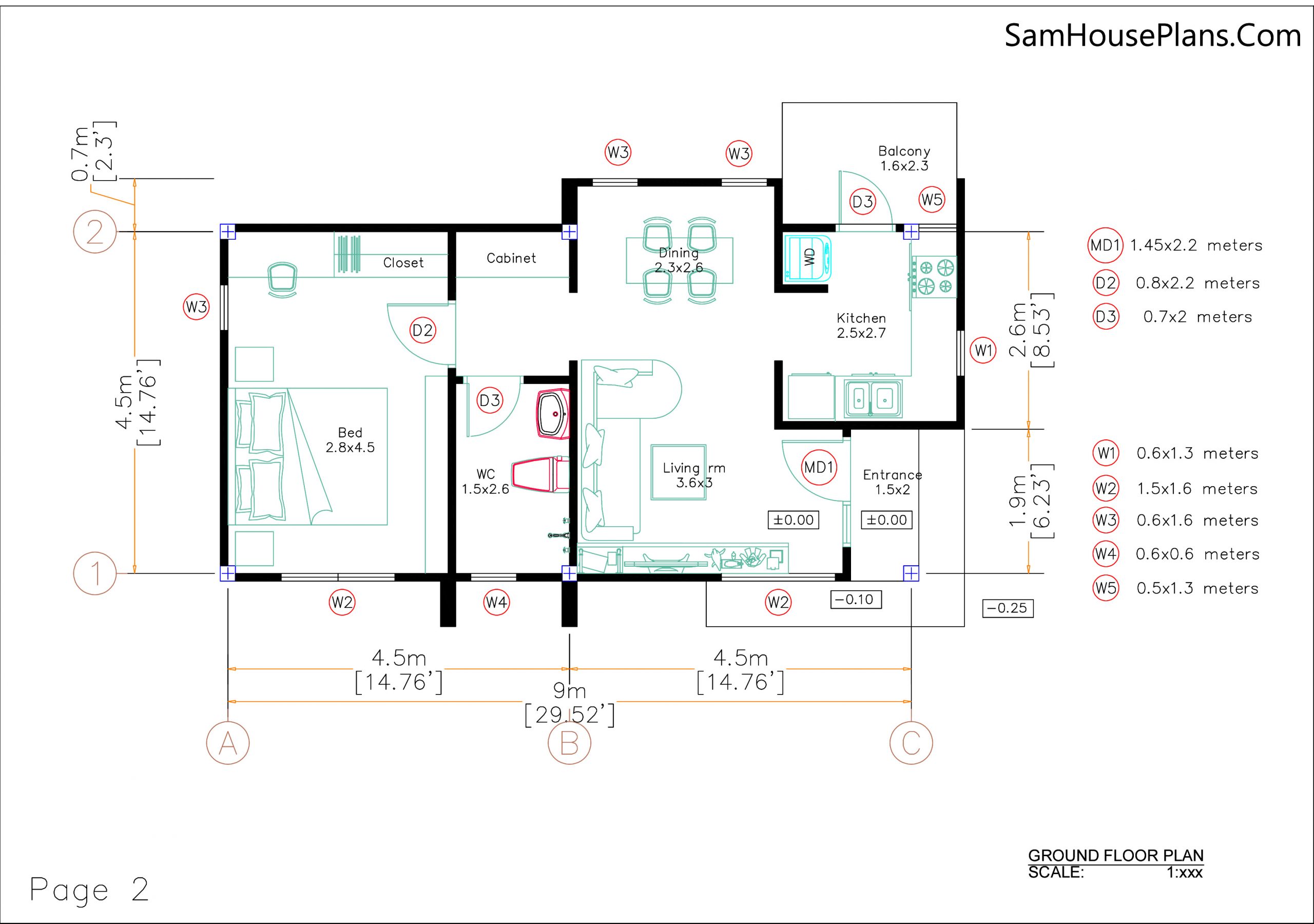 Small House Plan 4.5×9 Meter One Bedroom PDF Plan 1 Bathroom Full Plans. This house is perfect for single family. Est. Price around 10-15k usd construction only.