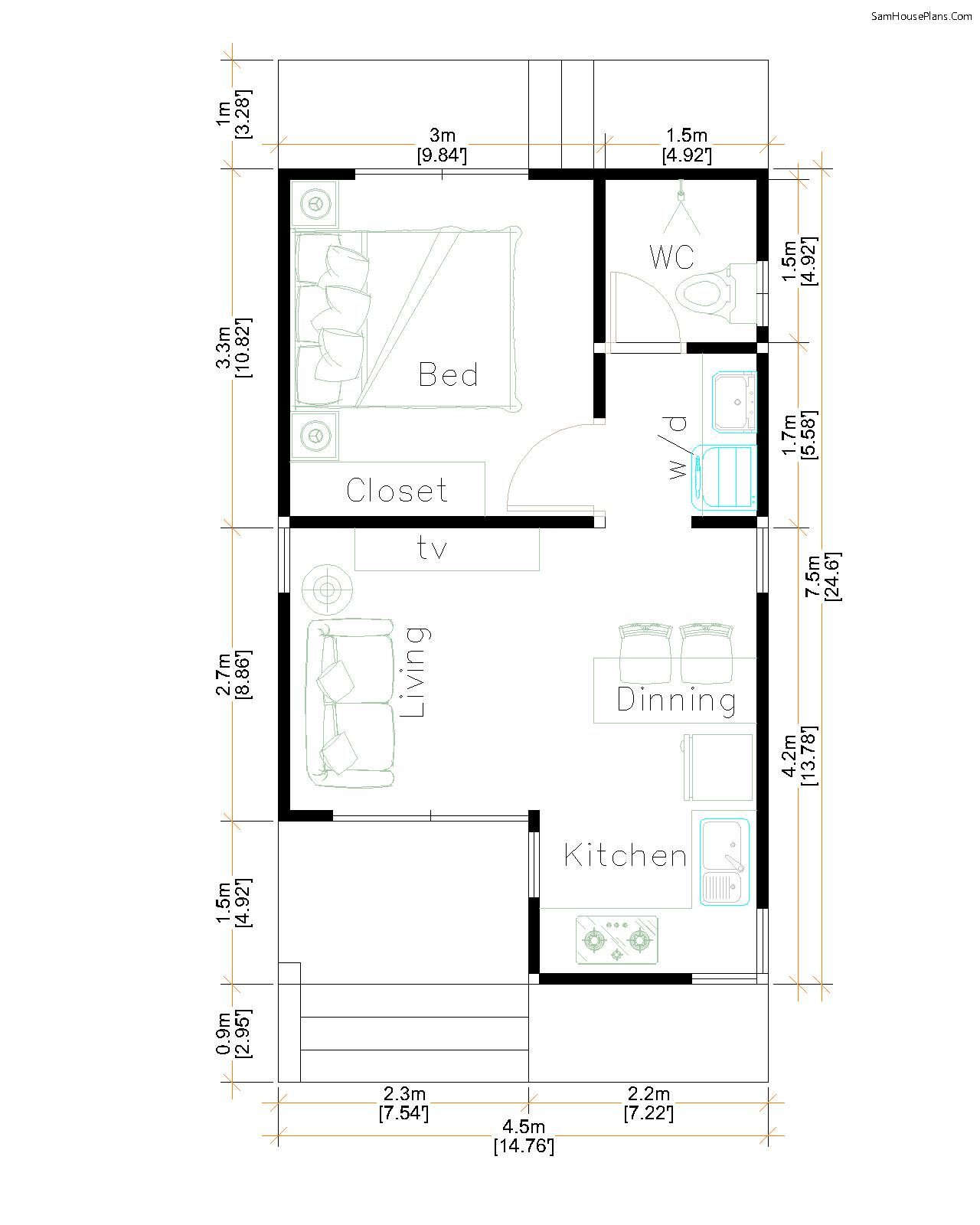 Small House Plans 4.5×7.5 with One Bedroom Shed roof. This villa is modeling by SAM-ARCHITECT With One story level. It’s has 1 bedroom 1 Bathroom.