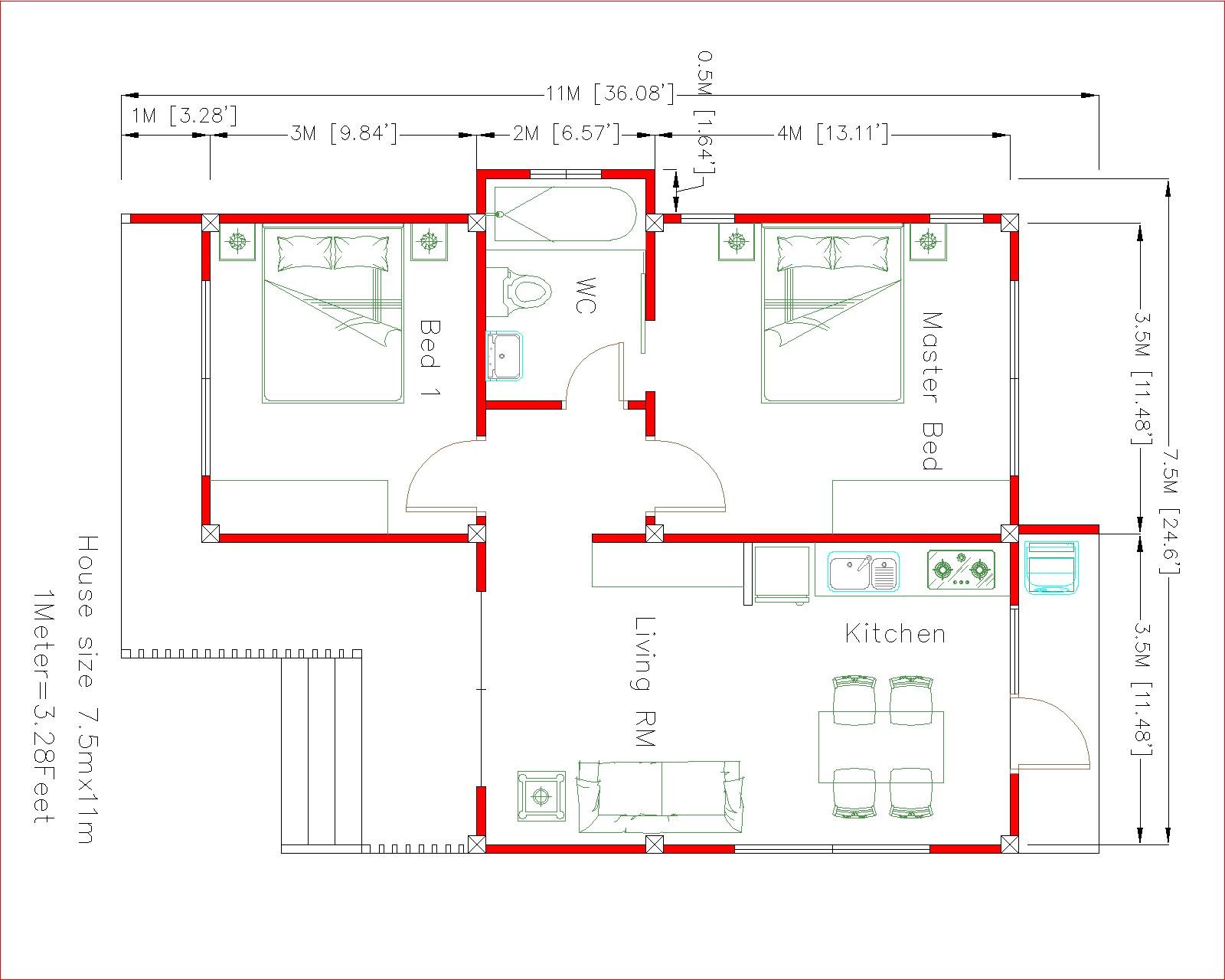 Small House Plans 7.5×11 with 2 Bedrooms Hip roof. This villa is modeling by SAM-ARCHITECT With One story level. It’s has 2 bedrooms 1 Bathroom.